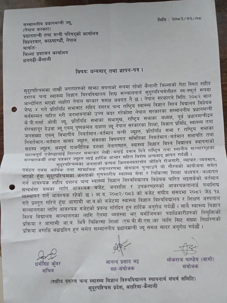 विश्वविद्यालय स्थापनार्थ संघर्ष समितिले बिहीबार प्रधानमन्त्री केपी शर्मा ओली र सुदूरपश्चिमका मुख्यमन्त्री कमल बहादुर शाहलाई ज्ञापनपत्र बुझाउँदै बजेट विनियोजनको माग गरिएको हो ।