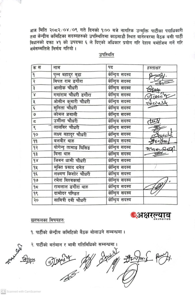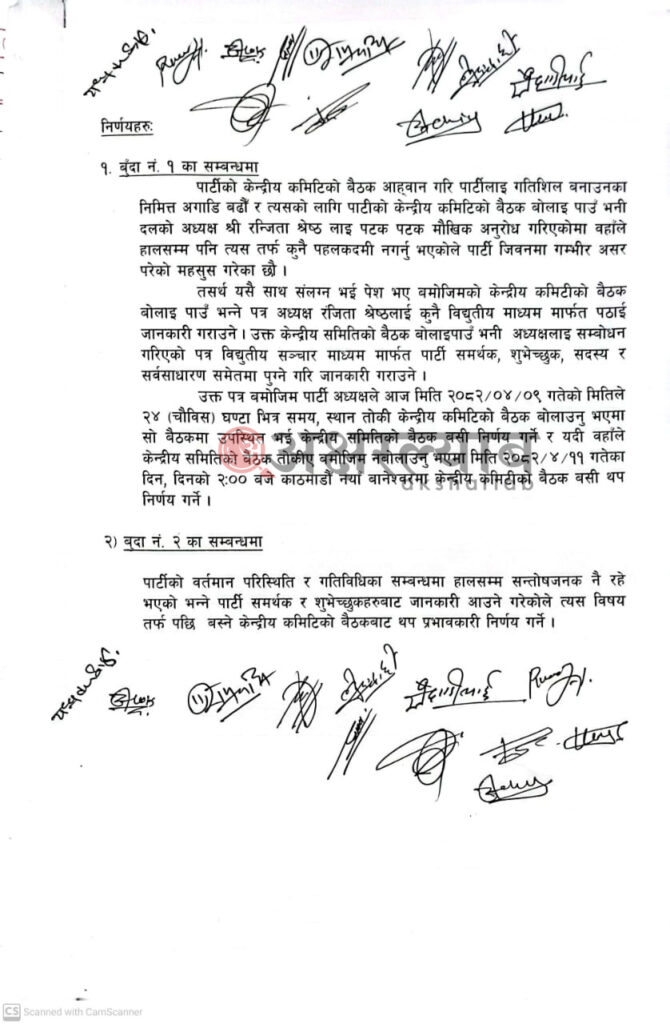 बैठकमा २१ जना केन्द्रीय सदस्यमध्ये १२ जना हस्ताक्षर रहेको छ ।