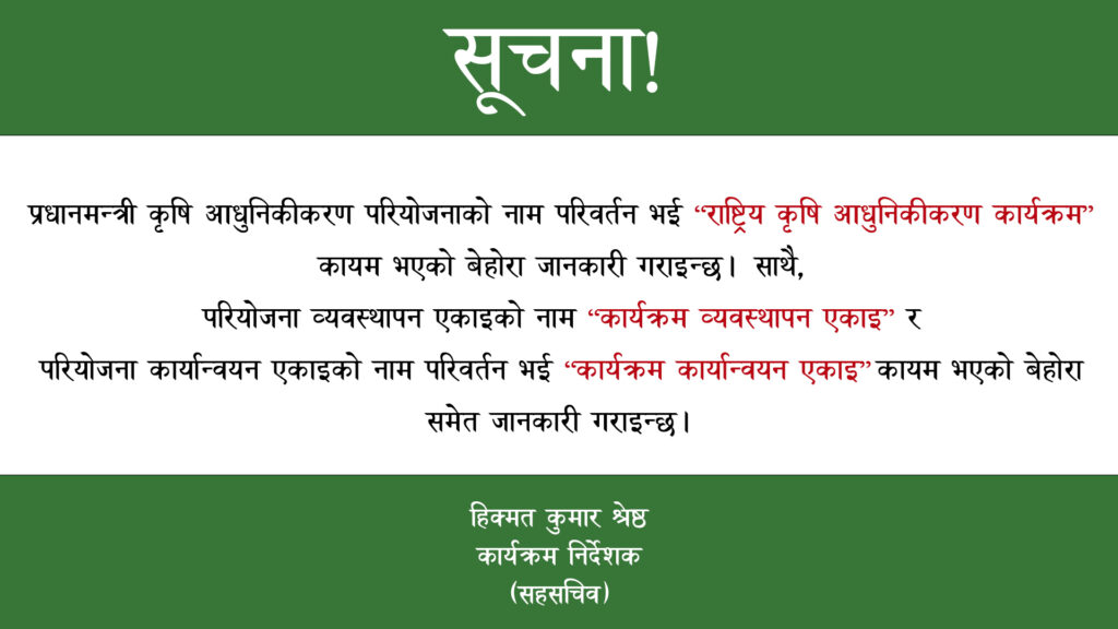 राष्ट्रिय कृषि आधुनिकीकरण कार्यक्रमका सूचना अधिकारी डा. जीत बहादुर चन्दले सरकारको निर्णयपछि साउन पहिलो सातादेखि नयाँ नाम कायम भएको जानकारी दिए ।