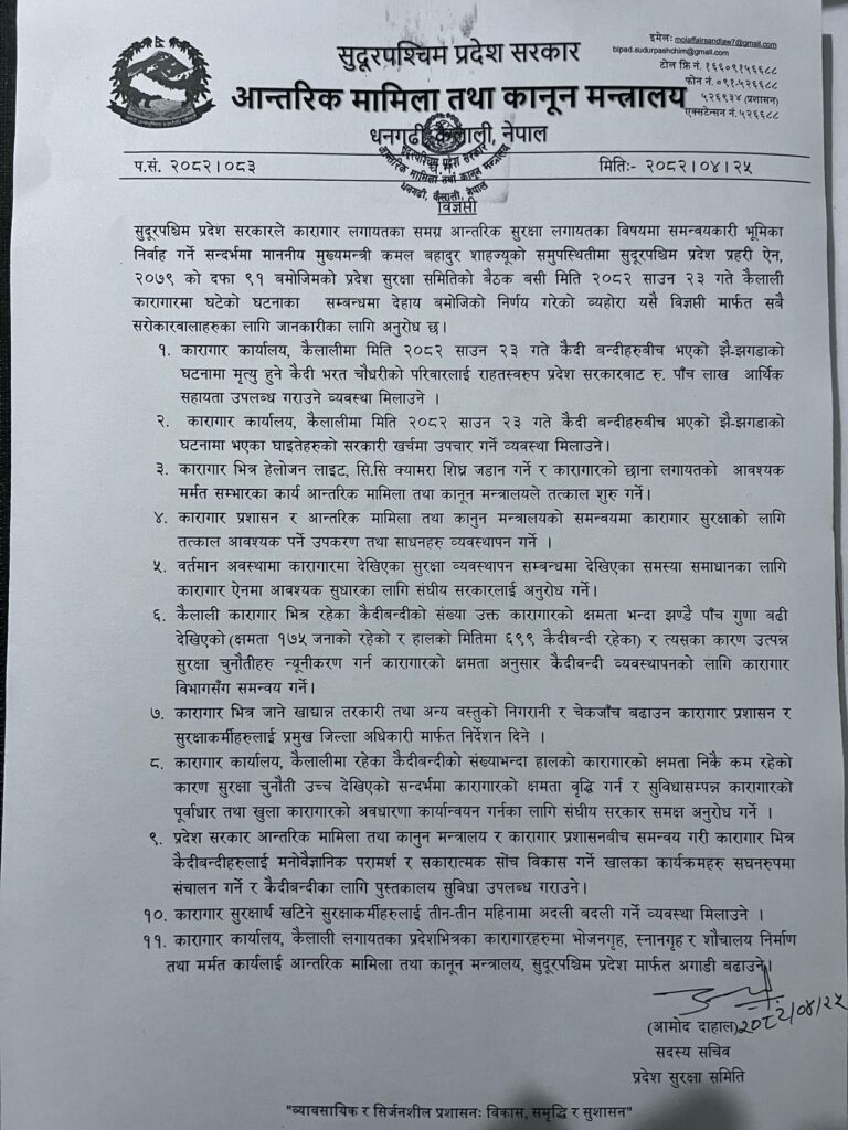 साउन २३ गते कैदीबन्दीबीच भएको झडपमा मृत्यु भएपछि सुदूरपश्चिम प्रदेश सरकारले कारागार व्यवस्थापन र सुरक्षा सुधारका लागि ११ बुँदे निर्देशन जारी गरेको हो । प्रदेश सरकारको आन्तरिक मामिला तथा कानुन मन्त्रालयले जारी गरेको निर्देशनमा मृतकको परिवारलाई सहयोग उपलब्ध गराउने र घाइतेहरूको निशुल्क उपचार गर्ने उल्लेख गरिएको छ ।