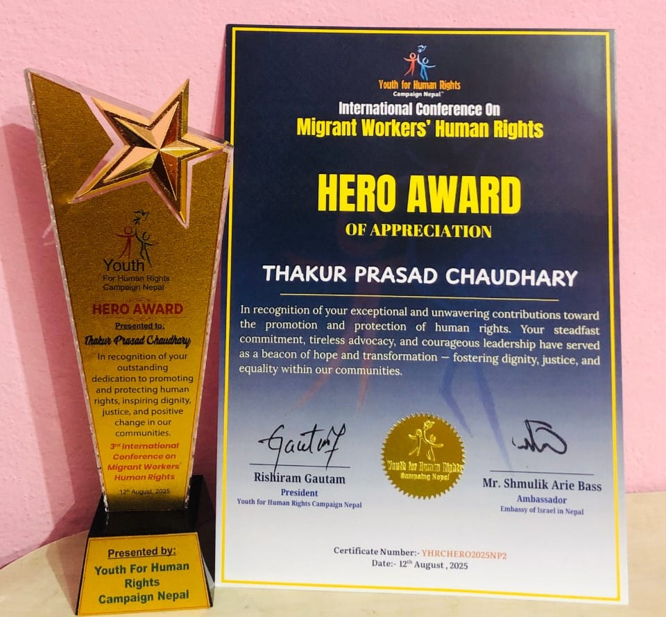 अन्तर्राष्ट्रिय युवा दिवसको अवसर पारेर मंगलबार काठमाडौंमा Youth for Human rights Campaign Nepal द्वारा आयोजित International Conference on ‘Migrant Workers’ Human Rights कार्यक्रमका बीच उनीसहित २ नेपाली र १ बंगलादेशी युवा अभियानतालाई सम्मानित गरिएको हो ।