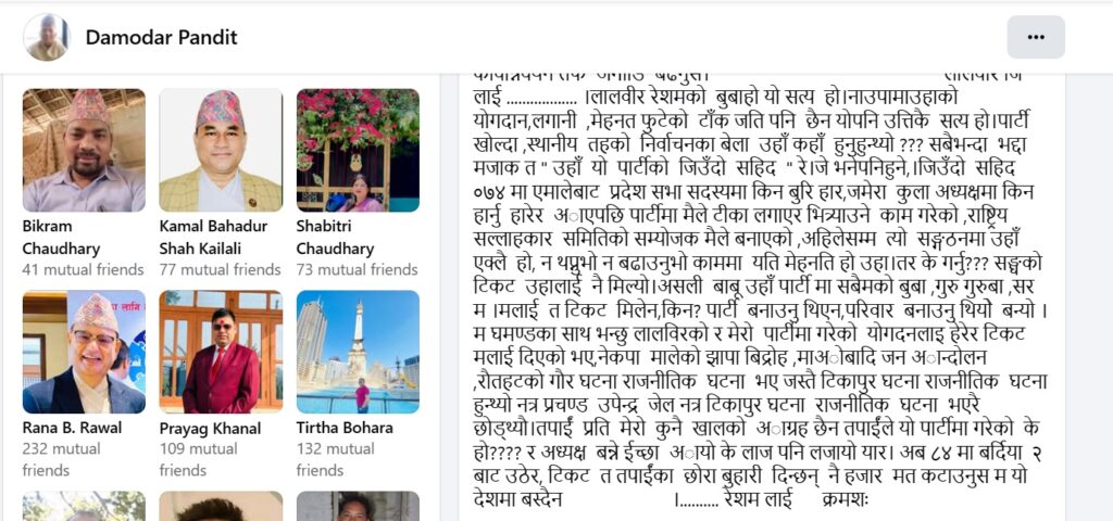 उनले लेखेका छन् ‘नाउपा आजको अबस्थामा किन र कसरी आयो ? तपाईं कहाँ–कहाँ चुक्नु भो ? सच्याउनुस । पार्टी बन्छ । तपाईं हामी बनाउँछौ । तपाईं कहाँ–कहाँ सच्चिने ? तपाईं ६४ को आमनिर्वाचनमा स्वतन्त्र लड्नु भो, तपाईंले पाएको मत सन्सारलाई थाहा छ मैले भनिन । तर मैले यति भने तपाईंको क्षमता, दक्षता, तपाईंले समाजलाई दिएको योगदानको सर्वोत्कृष्ट मत हो त्यो । पहिला तपाईं त्यो धरातलमा टेक्नुस् हावामा न उड्नुस् । तपाईं ०७० को आमनिर्वाचनमा कुनै पार्टीको तिर चुनाव चिन्ह लिएर लड्नु भो, त्यो मत तपाईं ७ पार्टीको सम्युक्त मत हो, मत कति ? मैले भनिन। सब जानकार छन् । तर तपाईं ०७४ सालको आमनिर्वाचनमा चुनाव लड्दा प्रवासमा रहेर पनि तपाईंले पाएको मत तपाईंको हैन । त्यो मत मुद्दाको हो, पहिचानको हो । राज्यले ०७२ भाद्र ७ पछि गरेको चरम दमनका बिरुद्धको अभिमत थियोे । रेशमलाई अन्याय भयो भन्ने हामी जस्ता माइग्रेट भएर आएका र धर्ती पुत्रहरुको संयुक्त मत थियोे त्यो । तर तपाईं त वाफ रे वाफ । मातेर हिडेको छाडा राँगो जस्तो, डामेर छाडेको छाडा साढे जस्तो भएर जेलबाट रिहाइपछि बोल्दै हिड्नु भो (मपनि साथमै छु) ।’