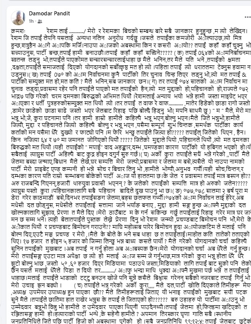 उनले लेखेका छन्, ‘लालवीर रेशमको बुवा हो । यो सत्य हो । नाउपामा उहाँको योगदान, लगानी, मेहनत फुटेको टाँक जति पनि छैन । यो पनि उत्तिकै सत्य हो । पार्टी खोल्दा, स्थानीय तहको निर्वाचनका बेला उहाँ कहाँ हुनुहुन्थ्यो ? सबैभन्दा भद्दा मजाक त उहाँ यो पार्टीको जिउँदो शहीद रे । जे भने पनि हुने ।’