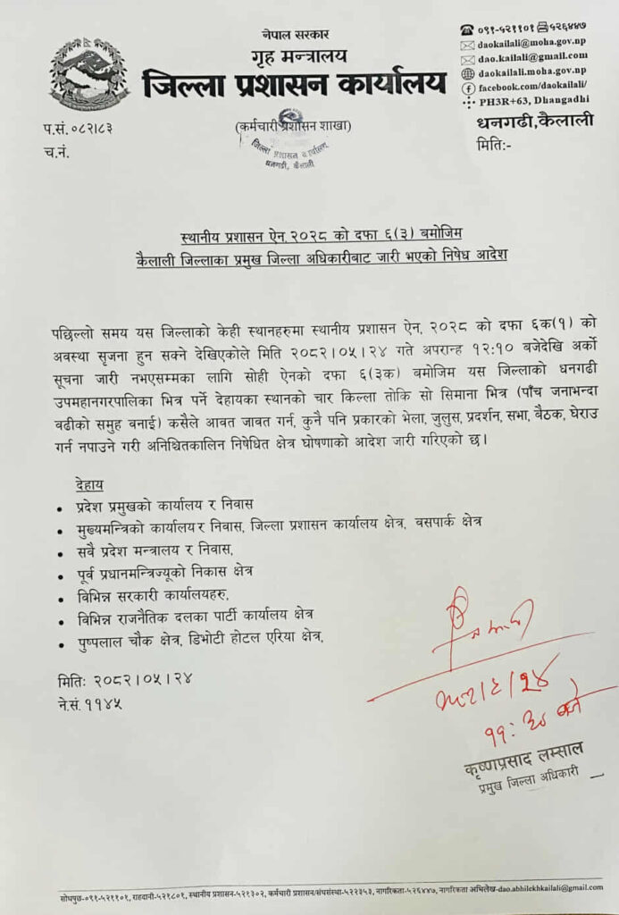 जेनजीको आन्दोलनलाई मध्यनजर गर्दै जिल्ला प्रशासन कार्यालय कैलालीले सुरक्षाका कारण देखाउँदै निषेधाज्ञा लागू गरेको छ ।