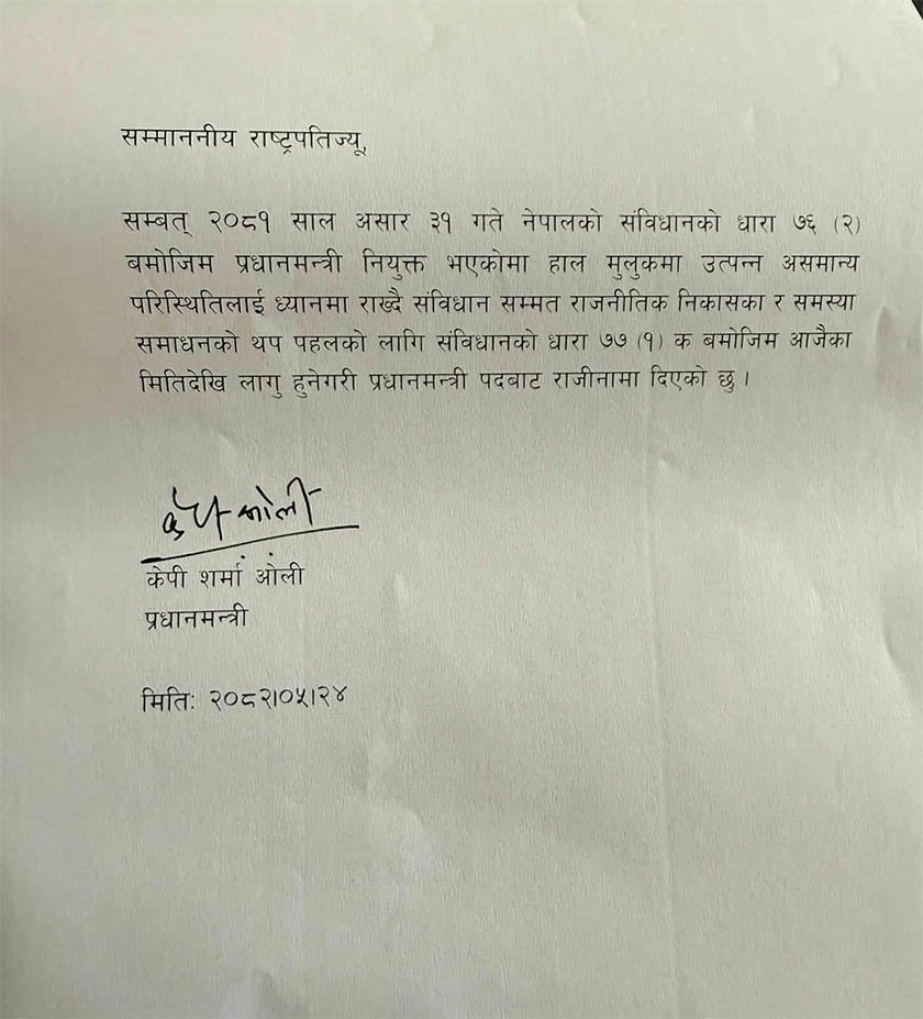 काठमाडौँ । प्रधानमन्त्री केपी शर्मा ओलीले पदबाट राजीनामा दिएका छन् । जेनजी आन्दोलन नियन्त्रणबाहिर गएर ठुलो जनधनको क्षति भएपछि उनले पदबाट राजीनामा दिएका हुन् ।