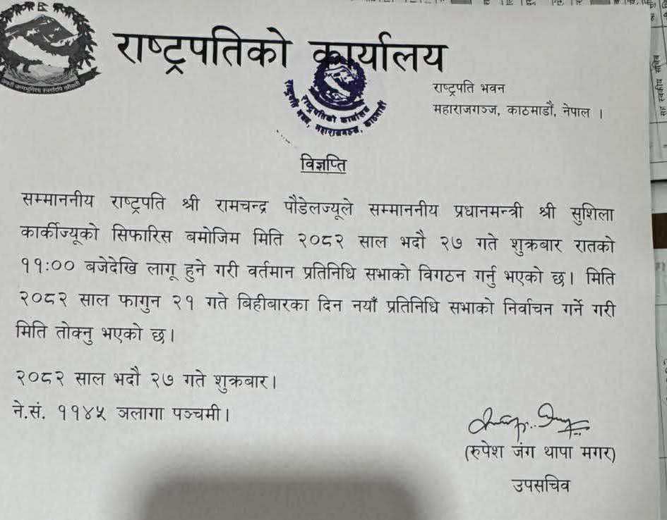 ‘सम्माननीय राष्ट्रपति श्री रामचन्द्र पौडेलज्यूले सम्माननीय प्रधानमन्त्री श्री सुशीला कार्कीज्यूको सिफारिस बमोजिम मिति २०८२ साल भदौ २७ गते शुक्रबार रातको ११ः०० बजेदेखि लागू हुने गरी वर्तमान प्रतिनिधि सभाको विगठन गर्नु भएको छ’, राष्ट्रपति कार्यालयका उपसचिव रुपेश जंग थापा मगरले जारी गरेको एउटा विज्ञप्तिमा लेखिएको छ ।