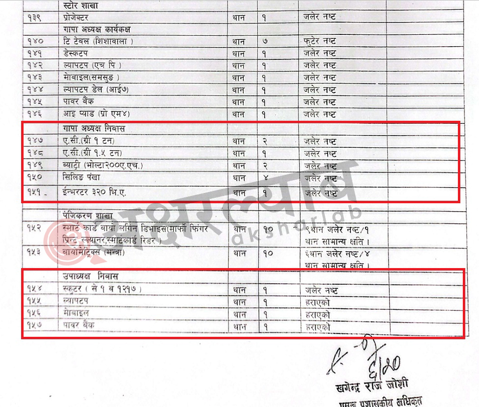 पालिकाले क्षतिको विवरण संकलन गरेको छ । क्षतिको विवरणभित्र पालिकाले गाउँपालिका अध्यक्ष चौधरीको निजी निवासमा जडान गरिएको महँगा विलासिताको उपकरण समेत जलेर नष्ट भएको विवरण भटिएको हो ।