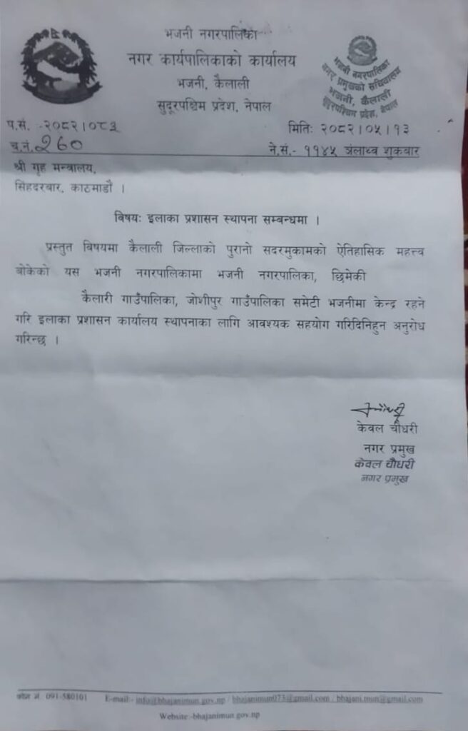 भजनी नगरष्पालिका, कैलारी गाउँपालिका र जोशीपुर गाउँपालिकालाई कार्यक्षेत्र तोक्दै इलाका प्रशासन कार्यालय स्थापनाको माग गरेका हुन् । जसको केन्द्र भजनीमा तोक्ने भनेर समेत पत्रचार गरिएको छ ।
