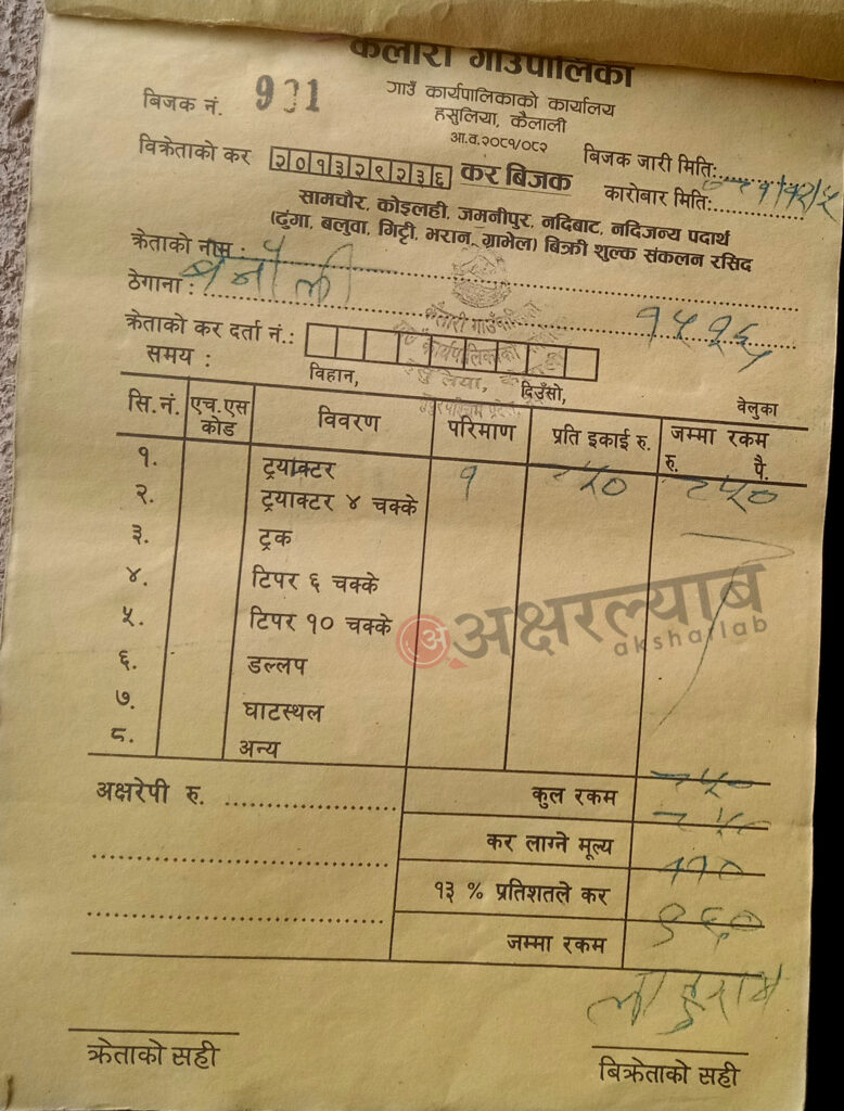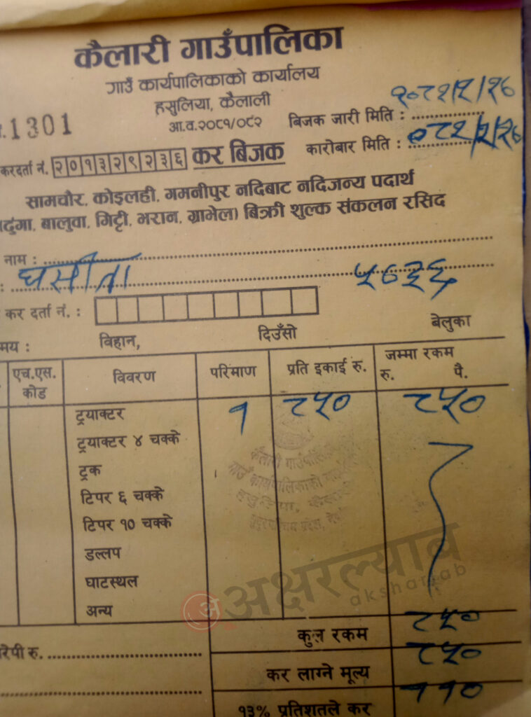 गाउँपालिकामा दाखिला नभएको ठेलीको रसिद । स्रोत : रोयल्टी संकलक